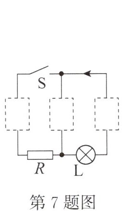 7. 将电源、电流表、电压表三个元器件的正确符号填入虚线框内,要求开关S闭合后,电流方向如图所示,电压表测量小灯泡两端的电压。