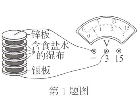 1. 意大利人伏打发明了最早的电池——伏打电堆,小明同学仿造了一个伏打电堆,并用电压表测量其电压,如图所示。此电池的正极是