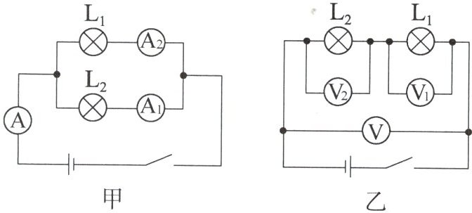 乙图为串联电路,电压表V测电源电压,电压表V1测L1两端电压,电压表V2测L2两端电压。在串联电路中,总电压等于各部分电路两端电压之和,即$U = U_1 + U_2$,且$U_2$与$U_1$大小取决于两灯泡的规格,若$L_2$的规格比$L_1$大,则$U_2 > U_1$成立。