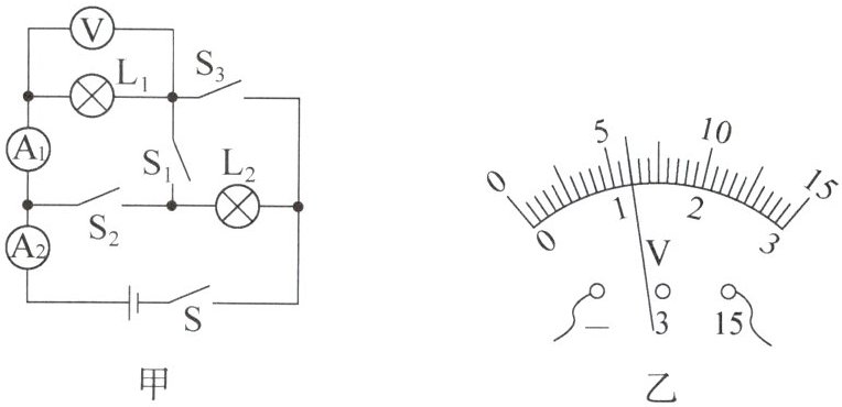 18. 如图所示的电路中,电源电压恒定。当$S_1$断开,S、$S_2、$$S_3$闭合时,电流表$A_1$的示数为0.4 A,电流表$A_2$的示数为0.5 A,电压表的示数如图乙所示。