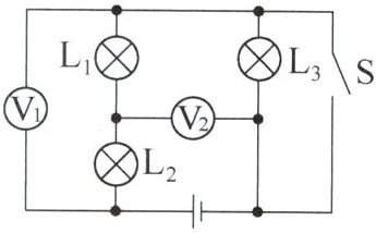 (1) 当开关S闭合时,电压表V₁示数为9V,此时电路中L₃被短路,V₁测量电源电压,故电源电压U=9V。