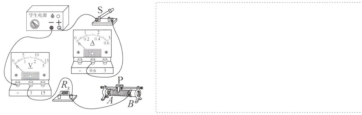实物连接:将电压表“-”接线柱与定值电阻$R_x$左端接线柱相连,电压表“3”接线柱与定值电阻$R_x$右端接线柱相连;滑动变阻器选择$A$接线柱与定值电阻$R_x$右端接线柱相连。