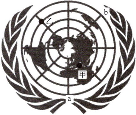 联合国徽章的图案(右图)是一幅以北极点为中心、方位角等距离的平面投影世界地图。图案由交叉的金色橄榄枝组成的花环相托,与白色水域交相映衬在淡蓝色背景上。地图的投影范围延伸至南纬60度,纬线由五个同心圆组成。徽章是希望的象征,代表着世界各国人民对和平与团结的梦想与渴望。读图,完成3~5题。