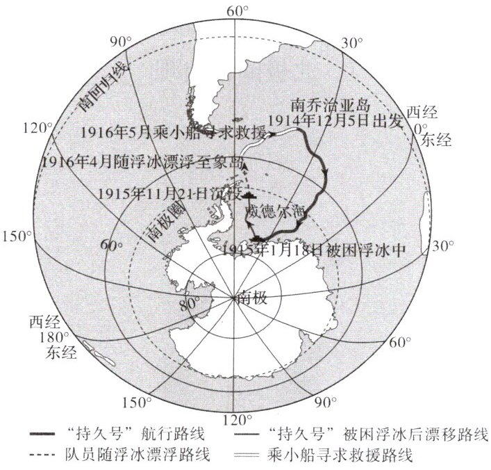每一次探险都值得铭记。1914年12月5日,英国探险家沙克尔顿和队员乘坐“持久号”航船前往南极探险,被困极地20个月后获救。下图为沙克尔顿探险及遇险后的求援路线示意图。读图,完成6~8题。