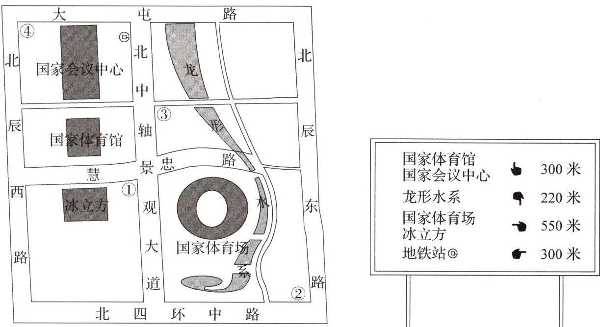 在2022年北京冬奥会中,“水立方”被升级改造为“冰立方”,作为冰壶比赛场地;国家体育馆被改造为花样滑冰等冰上项目比赛场地。下图为部分奥运场馆分布及指示牌示意图。读图,完成5~6题。