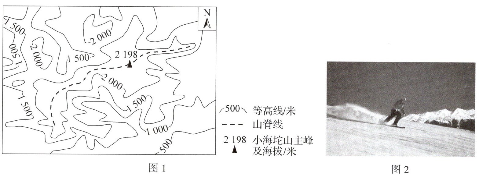 7. 小海坨山为北京冬奥会国家高山滑雪中心所在地。图1为小海坨山区域等高线地形图,图2为室外滑雪照片。读图,完成下列要求。