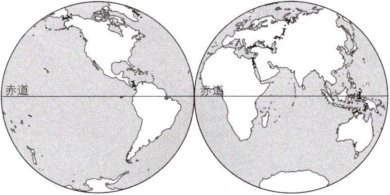 读东西半球图,完成6~7题。