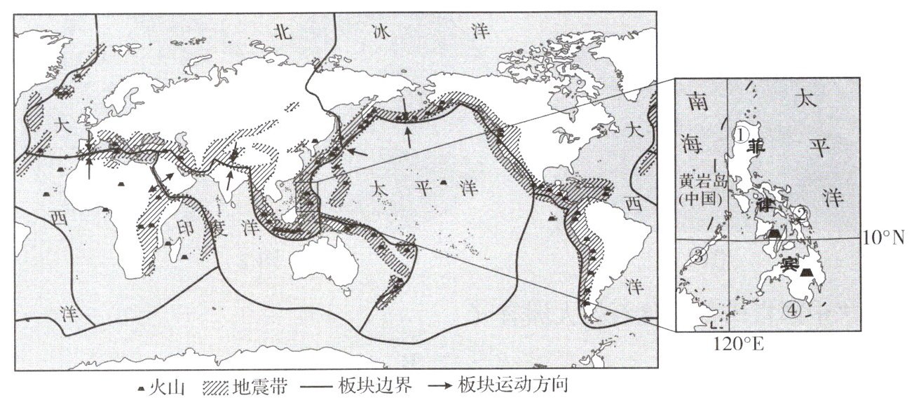 (3)通过探究,同学们了解到菲律宾处于______火山、地震带,其火山、地震频发的主要原因是其位于______板块和______板块的______(填“挤压”或“张裂”)地带,地壳运动活跃。