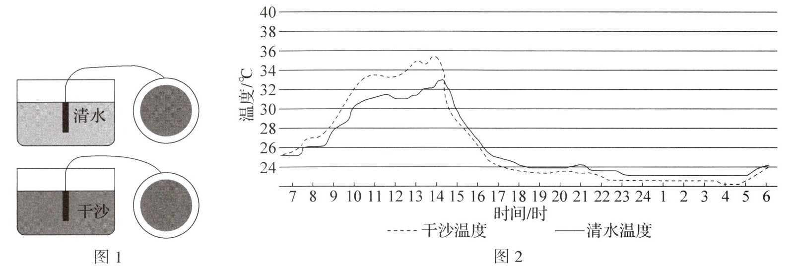 。(2)在晴朗的天气条件下,将盛有清水和干沙的玻璃容器同时放置在室外,插入温度传感器进行自动测温(图1),并把温度上传到记录仪上,记录的数据见图2。