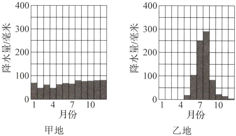 下图为北半球甲、乙两地的降水量柱状图。读图,完成第6题。