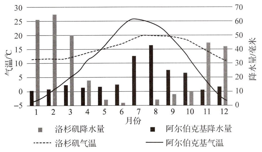 美国城市洛杉矶与阿尔伯克基均位于$35^{\circ}N$附近。读洛杉矶与阿尔伯克基气温曲线和降水量柱状图,完成3~4题。
