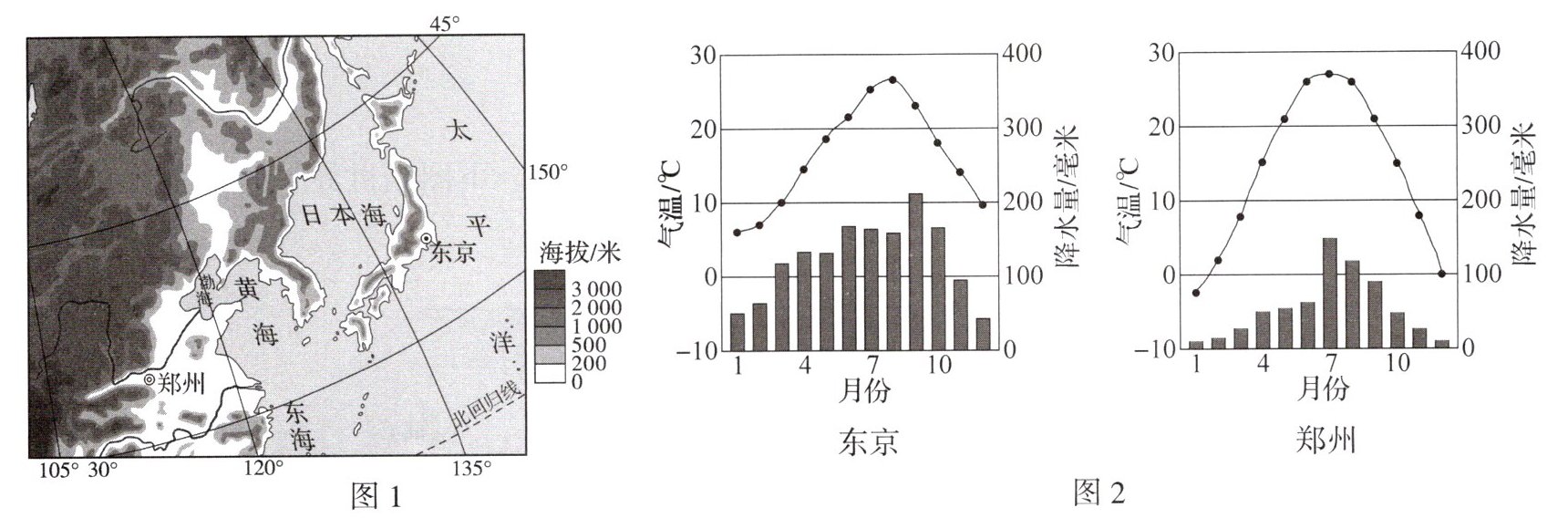 图1示意东京和郑州的位置,图2为两地气温曲线和降水量柱状图。读图,完成1~2题。