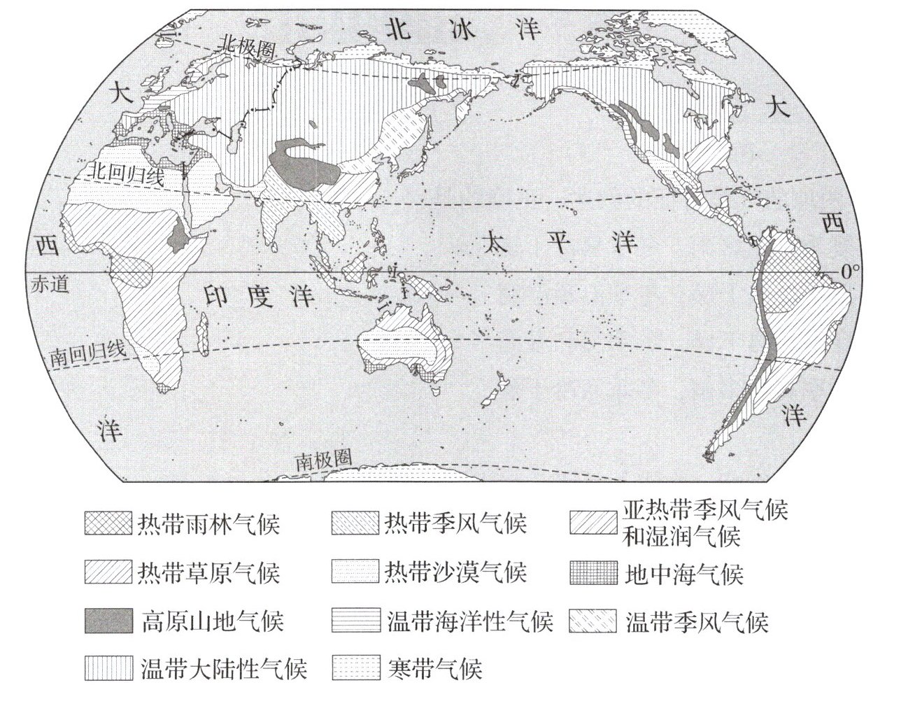 5. 某中学地理兴趣小组开展以“发现气候”为主题的学习活动。下图是世界气候类型分布图。阅读图文材料,完成下列要求。