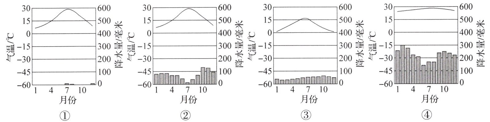 甘蔗是常见的糖料作物。甘蔗喜热、喜湿、喜光,对热量的要求尤其高,冬季最低温度如果低于$0^{\circ}C$,就会遭到冻害。下图为四类气候的气温曲线与降水量柱状图。