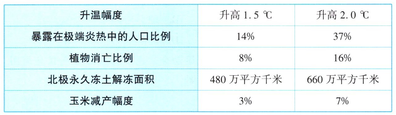 2018年,联合国政府间气候变化专门委员会发布了《全球升温$1.5^{\circ}C$特别报告》,明确指出全球气温升高$1.5^{\circ}C与升高2.0^{\circ}C$相比,影响大不一样(见下表)。