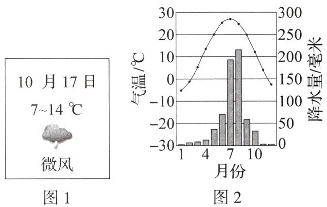2023年10月17日,北京市某中学召开校运动会。图1为当日天气信息简图,图2为北京市气温曲线和降水量柱状图。读图,完成4~5题。