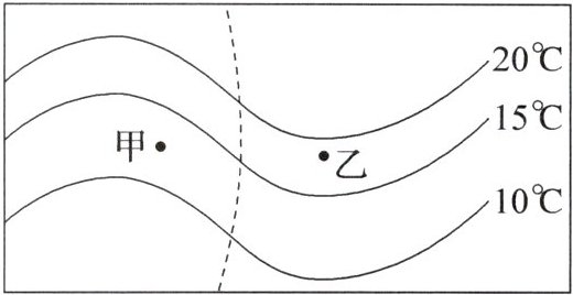 读某地区7月份等温线分布示意图,甲、乙两地纬度相同,虚线表示海岸线。据此完成1~3题。