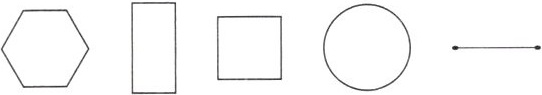 从左到右分别是六边形、长方形、正方形、圆、线段.这些几何图形的各部分都在同一平面内.