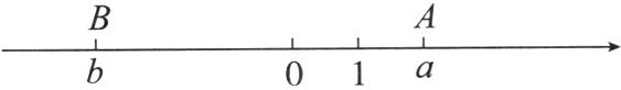 解:根据题意可知,b 是负数,则$|b|=-b.$设有理数$-a,-b$在数轴上的对应点分别为C,D,则点A,B,C,D在数轴上的位置如图所示.BCAD01a−bb−a 因为数轴上左边的数小于右边的数,所以$b<-a<a<-b$,即$b<-a<a<|b|.$