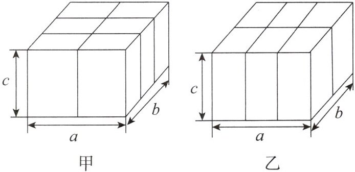 包装物品用到的箱子的长、宽、高分别为 $ a\ cm $,$ b\ cm $,$ c\ cm $,如图所示,小明和小华在打包时,分别采用了甲、乙两种打包方式(单位:cm,打包带不计接头处的长)。