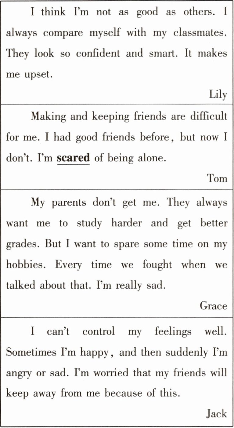 1. B 2. A 由Lily的便条中最后三句可知,Lily经常拿自己跟同学比较,且认为同学都比自己自信、聪明。3. C 由上文可知本句句意为“我害怕独处”。scared意为“害怕的”,与afraid同义。4. D 由Grace的便条内容可知,Grace的父母不理解她。5. C 文章围绕青少年成长中的烦恼展开,如自我认知、交友、与父母的矛盾、情绪问题等,故这篇文章有可能来自一个与青少年相关的网站。