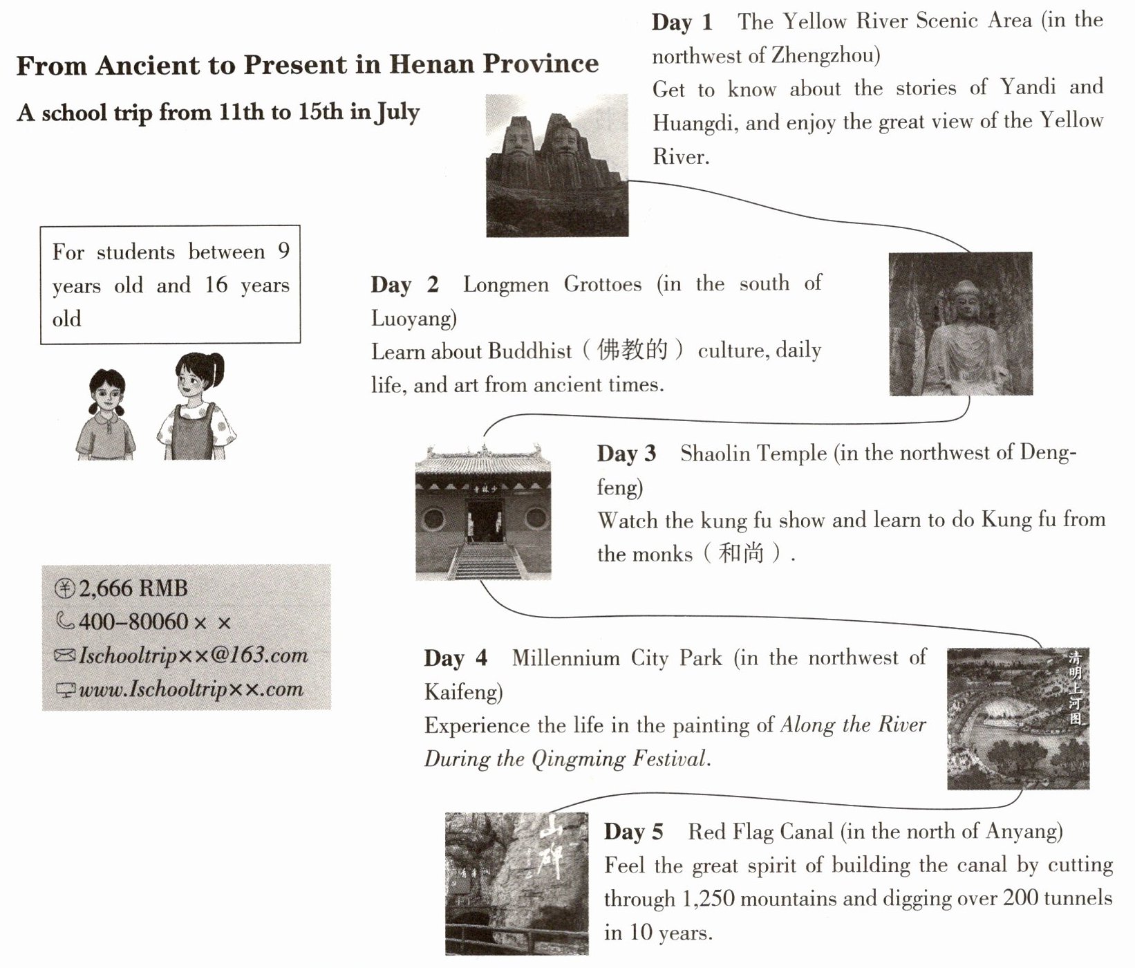 )1.How many days does the school trip last?A.Two days. B.Five days.
