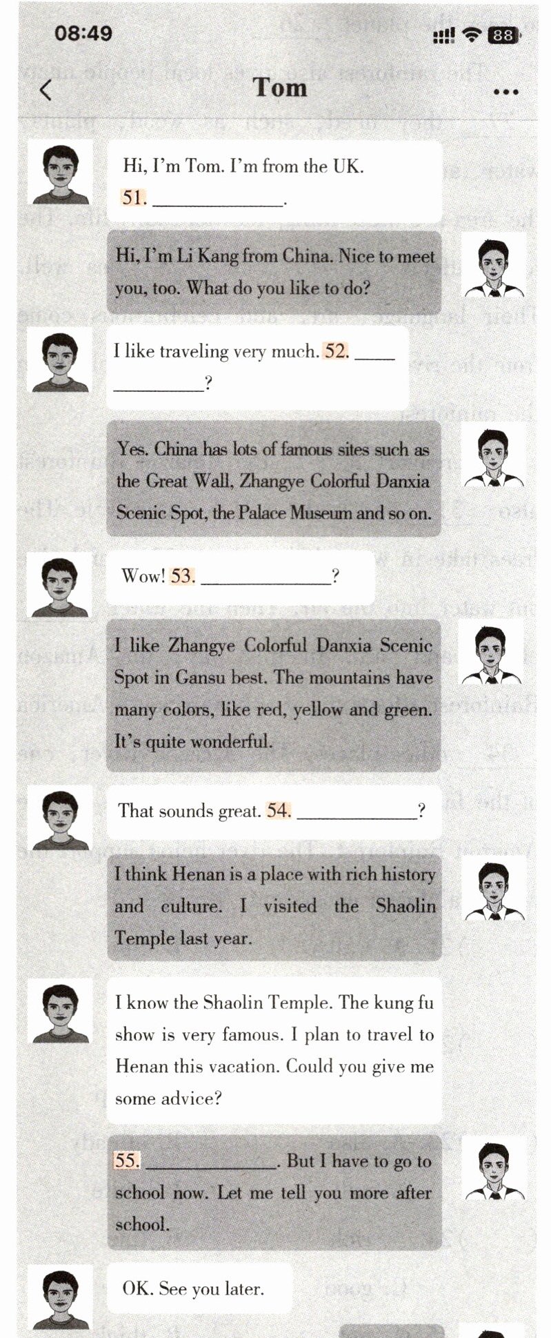根据下面的对话情景,在每个空白处填上一个适当的句子,使对话的意思连贯、完整。