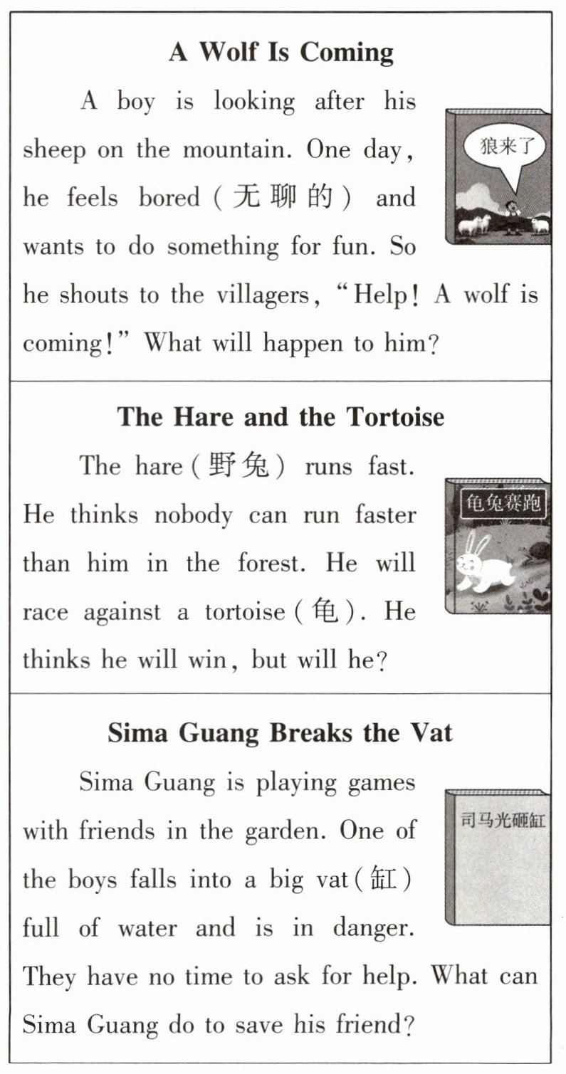 )3. What’s the book Sima Guang Breaks the Vat about?A. It’s about Sima Guang and a wolf.