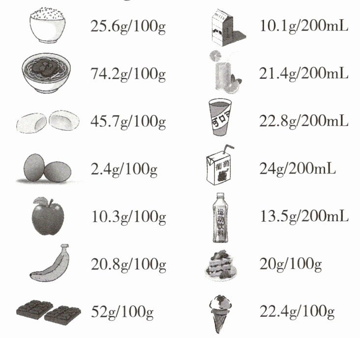 4. C 由材料内容可知,两块巧克力的含糖量为52g,一杯橙汁的含糖量为21.4g,含糖量共73.4g。
