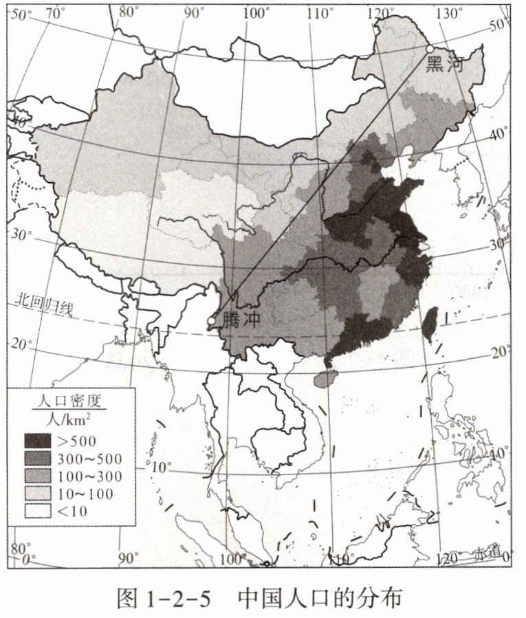 人口分布是指人口在一定时间内的空间存在形式、分布状况。影响人口分布的因素有自然环境和社会经济条件。读图 1-2-5,回答第 9~10 题。