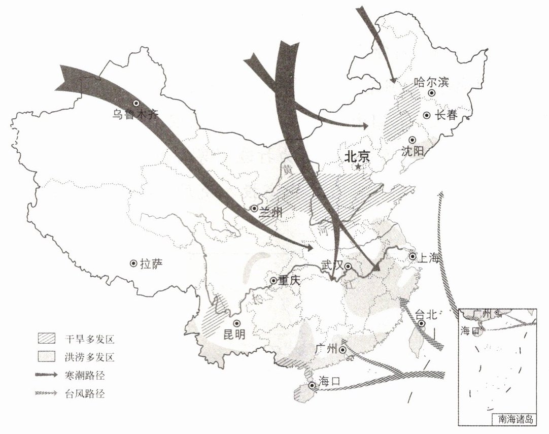 2024 年,我国自然灾害以洪涝、干旱、台风灾害为主,地震和沙尘暴等灾害也有不同程度发生。读图 2 - 4 - 1,回答第 1 ~ 2 题。