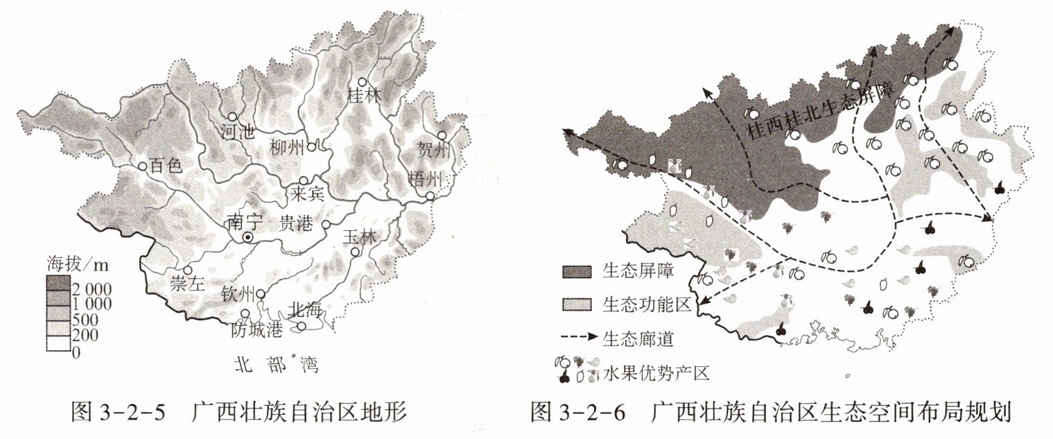 (1)广西壮族自治区位于云贵高原与两广丘陵的过渡地带,总体海拔较
