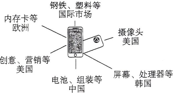 5. 某品牌手机设计和操作软件来自美国总部,处理器来自韩国,产品组装在中国完成(如下图所示),然后销往国际市场。中国在组装中仅获取产品价值的7%。结合下图,回答下列问题。