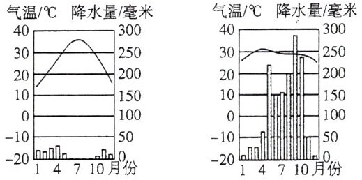 资料二 传统民居可以反映聚落与自然环境的关系。下图为两地传统民居景观图以及两地气温曲线和降水量柱状图。