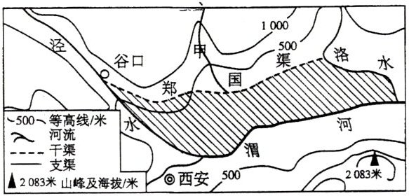 (2025广东潮州模拟)建于战国时期的郑国渠是我国古代最长的自流灌溉系统,引泾水缓缓流入洛水,灌溉渭河以北农田。下图为郑国渠及其附近区域地形分布图。据此完成19~21题。