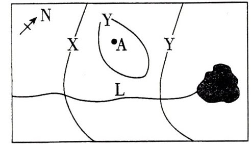 22. 下图为某地等高线地形图(局部),图中X、Y为等高线(等高距为100米),X海拔500米,L为河流,H为湖泊。关于图中信息的判断,正确的是(