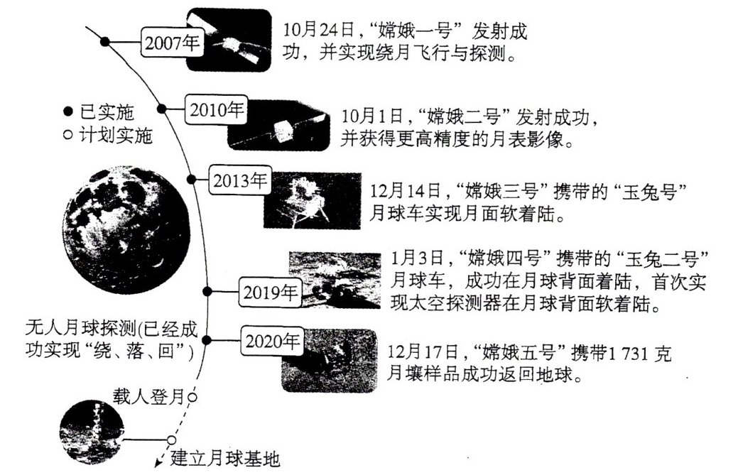 探月工程是利用航天器对月球进行探测,旨在获取月球表面信息、分析月面元素含量、探测月壤特性等。我国的探月工程称为“嫦娥工程”,其命名源于我国古代神话故事——嫦娥奔月。读地球和月球在太阳系中的位置和我国探月工程主要历程示意图,完成5~7题。