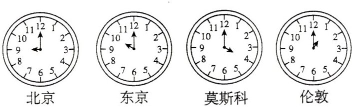 暑假,小明到广州旅游,入住酒店时,他发现酒店大堂墙面上四个城市的钟表时间不一样(如下图所示)。读图,完成12~14题。
