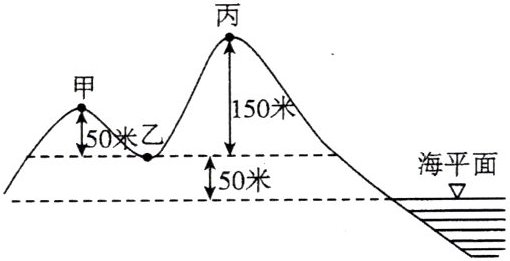 1. 该兴趣小组在探险地附近发现了一块竖立的地形示意图(如下图所示),标注了甲、乙、丙三地的地形信息,读图,下列叙述正确的是(