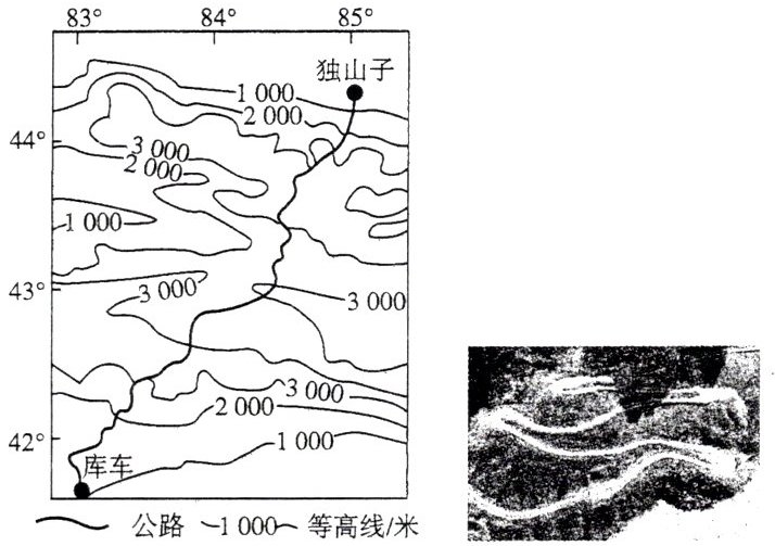 独库公路(独山子至库车段)横穿天山山脉,又称天山公路。下图为独库公路区等高线地形图及独库公路部分路段景观图。读图,完成4~5题。