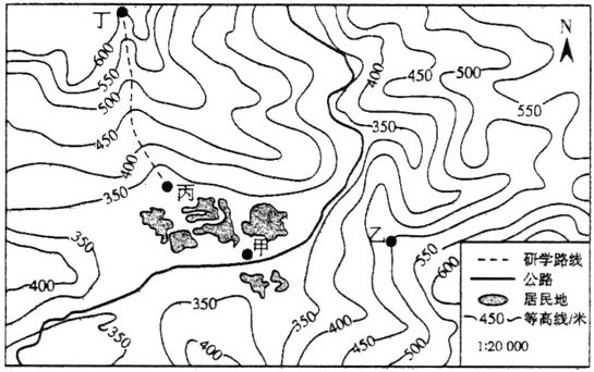 1. 研学路线上丙地与丁地的相对高度可能是(