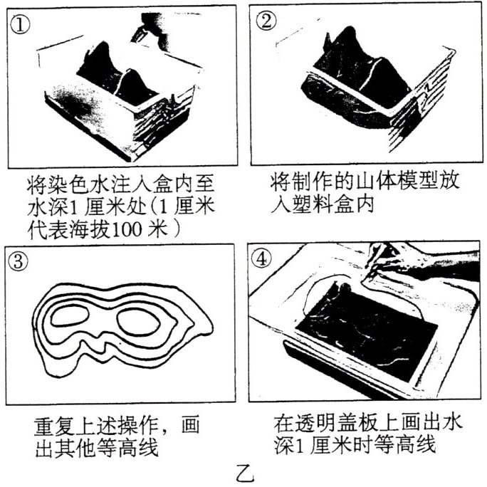 (1)图乙是某同学绘制等高线地形图过程的图片,正确排序是