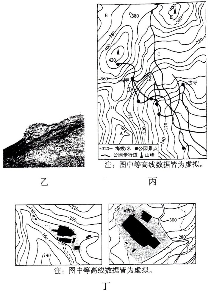 某同学去当地某公园拍照打卡。公园内有多座古寺分布其间。图乙是同学拍摄的野外图片,图丙为该公园地形略图,图丁为 a、b 两古寺略图。