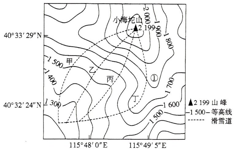 高山滑雪是在山坡上进行的雪上运动,具有鲜明的自然属性,是滑雪运动的象征与精华。2022年北京冬奥会高山滑雪项目曾在北京延庆区小海坨山举行。读小海坨山地区等高线分布图(单位:米),完成(1)~(2)题。
