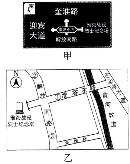 徐州某中学学生步行前往淮海战役烈士纪念塔参加清明祭扫活动。图甲为该学生途中迎面看到的道路指示牌,图乙为淮海战役烈士纪念塔位置示意图。据此完成(1)~(2)题。