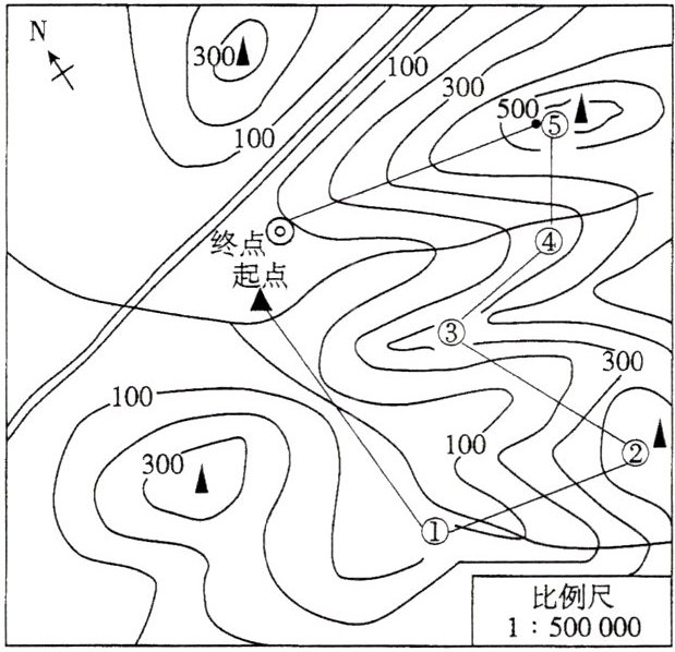 ,若量得起点到点①的图上距离约为3厘米,则二者实地直线距离大约为15