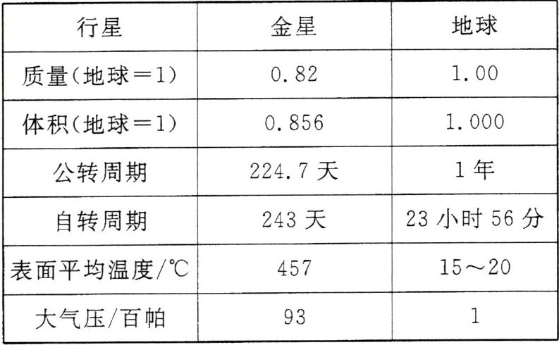 金星是地球的“姊妹星”,自身有稠密的大气层,其厚度是地球大气层的数十倍,其中二氧化碳占比约 97%。金星表面的平均温度高达 457°C,是太阳系中“最热”的行星。下表示意金星和地球的数据资料,简述金星没有生命存在的原因。
