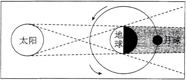 (2025 江门期末)月食是一种特殊的天文现象,当月球运行至地球的阴影部分时,在月球和地球之间的地区会因为太阳光被地球所遮蔽,就看到月球被地球遮住部分的边缘是圆弧形。下图是月食示意图。读图,完成 1~3 题。