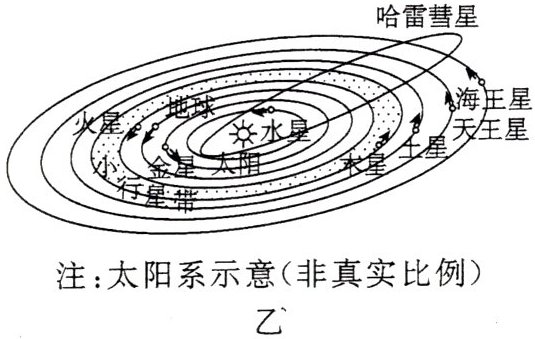 6. 地球的宇宙环境指大气层外的环境。宇宙中运动着的天体因互相吸引和互相绕转形成天体系统,并组成了多层次的天体系统。图甲示意不同级别的天体系统,图乙为太阳系模式图。阅读图文资料,回答下列问题。