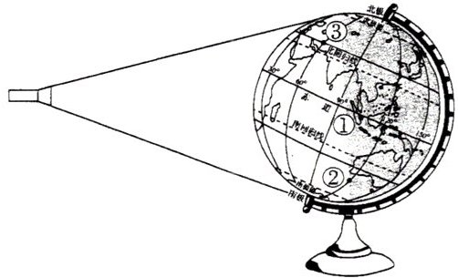 将一把手电筒放在桌子上代表太阳,在手电筒旁放置一个地球仪代表地球,拨动地球仪模拟地球运动(如下图)。据此完成3~4题。